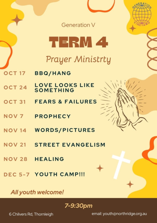 Generation V is a youth group for children in high school, which meets at church on Friday nights during the school term.